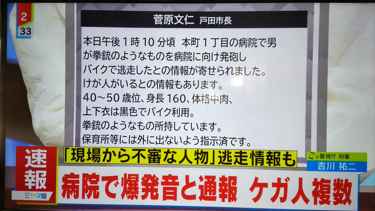 2023/10/31 #ゴゴスマ 速報 埼玉県戸田市 戸田中央総合病院の前で発砲音か 不審な人物逃走 pic.twitter.com/wp9hts6v7Y